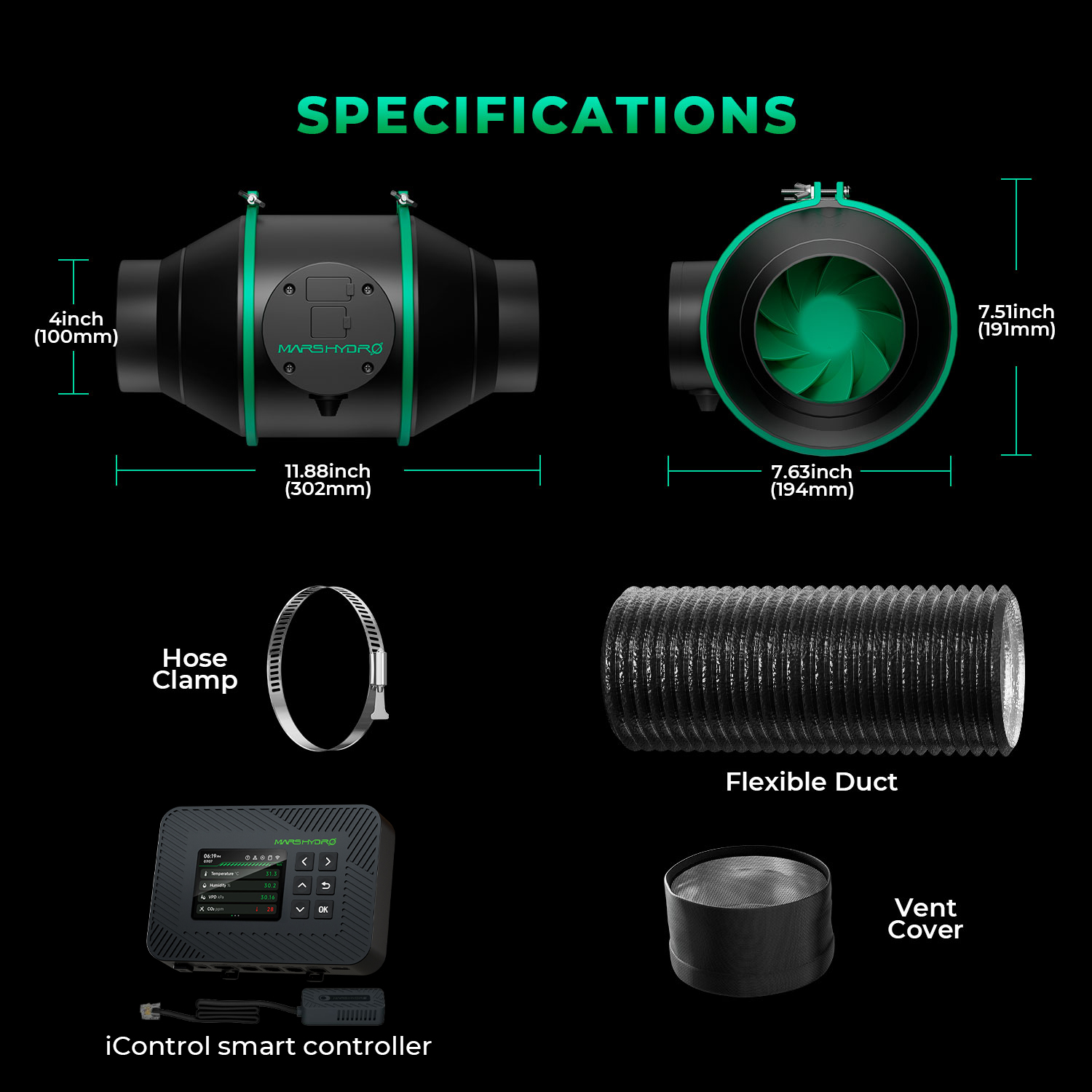 Mars Hydro 4" Inline Duct Fan and Carbon Filter Combo with iControl Smart Controller