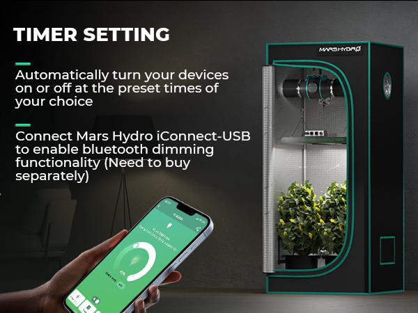 To add smart control features for "Inline Fan", please select the "iconnect smart controller" in "add-on". The most affordable complete grow tent kit, perfect for budget-conscious beginners. Designed for small-scale growing, it supports all grow stages for 1-2 plants or serves as a dedicated solution for the seedling stage. 【TS600 Grow Tent Kit Complete System Includes】Mars Hydro TS600 grow light, 60x60x140cm grow tent, 4"inline fan with speed controller, 4"carbon filter, 33ft length flex ducting, duct clamps,6.5" clip fan, grow room glasses,  elastic trellis net, 3 x grow bags, timer, humidity thermometer, pruning shears, corner shelf, rope hanger.